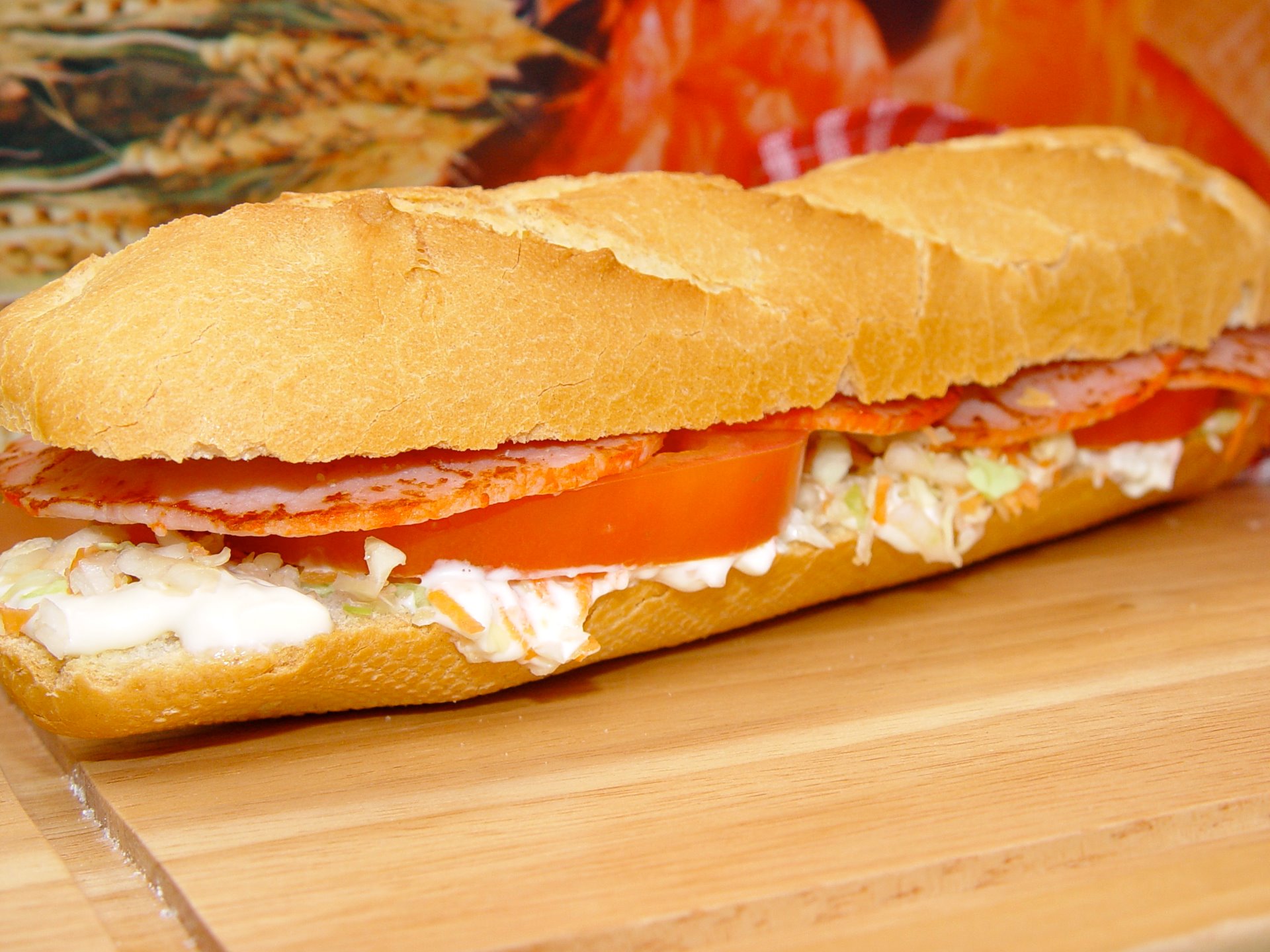 Bocata de pechuga; queso, tomate natural, col rayada con zanahoria y alioli. 3,95€ + papas fritas 6,25€