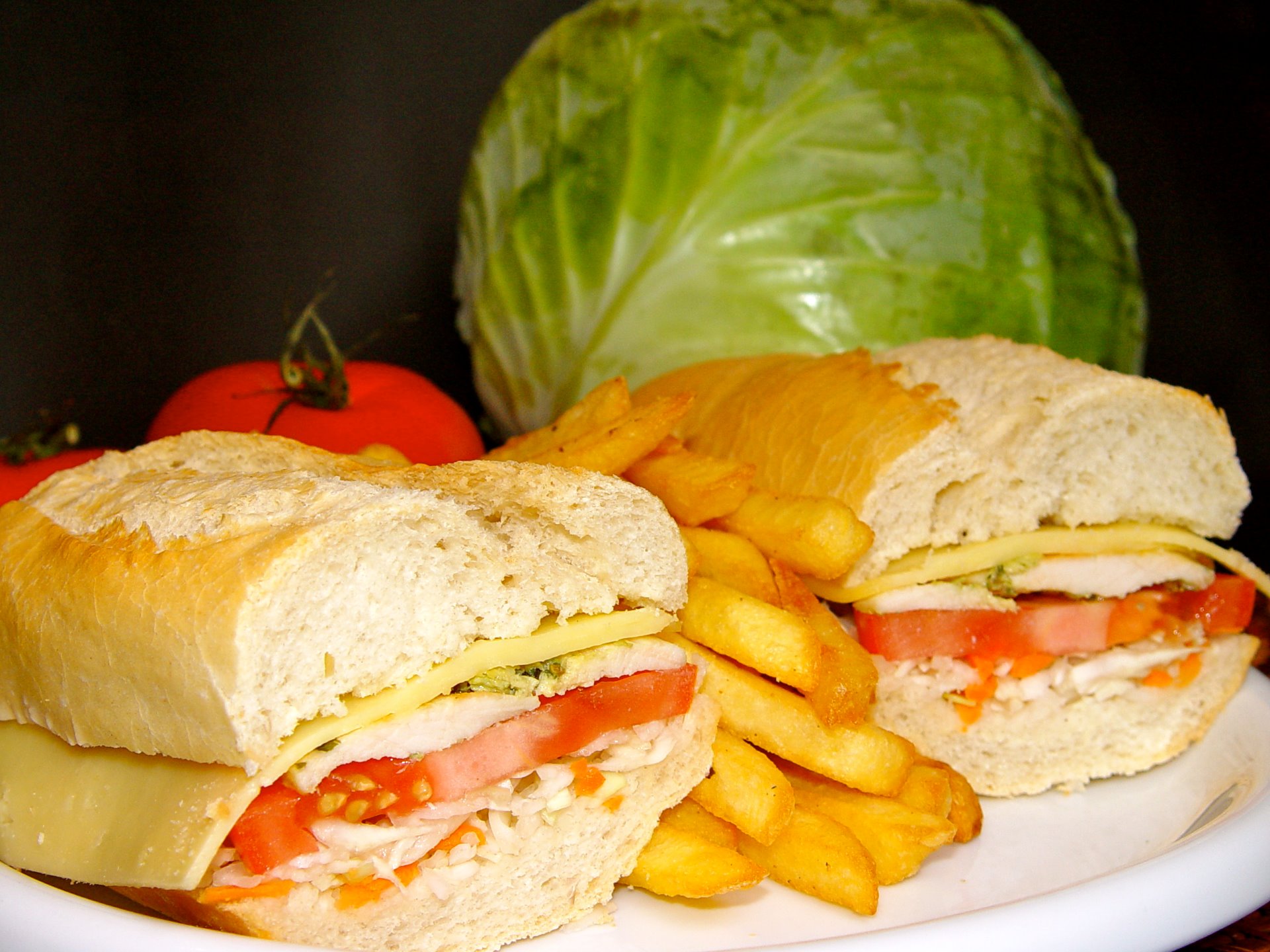 Bocata de pechuga; queso, tomate natural, col rayada con zanahoria y alioli. 3,95€ + papas fritas 6,25€