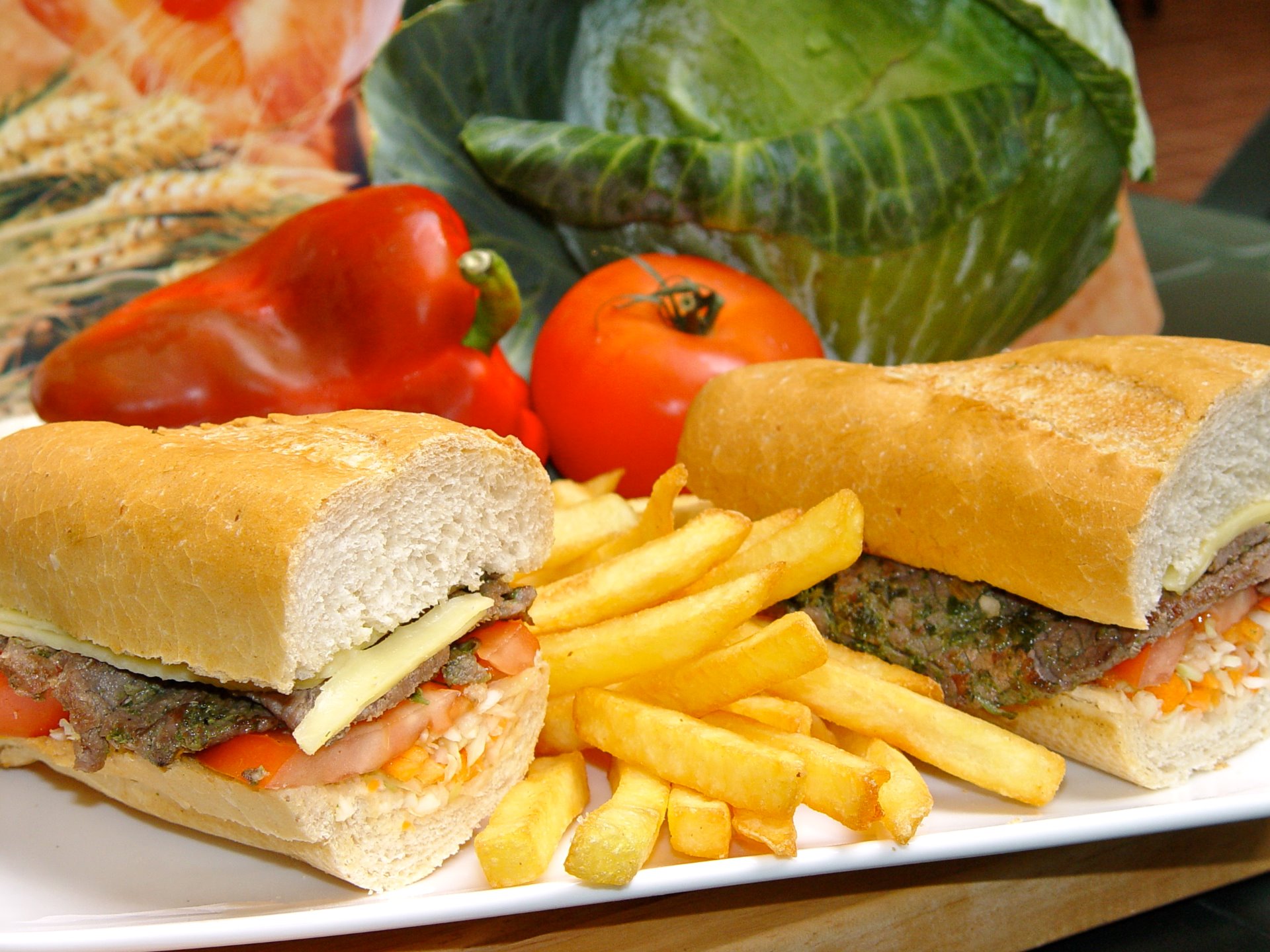 Bocata de lomo; queso, tomate natural, col rayada con zanahoria y alioli. 3,95€ + papas fritas 6,25€