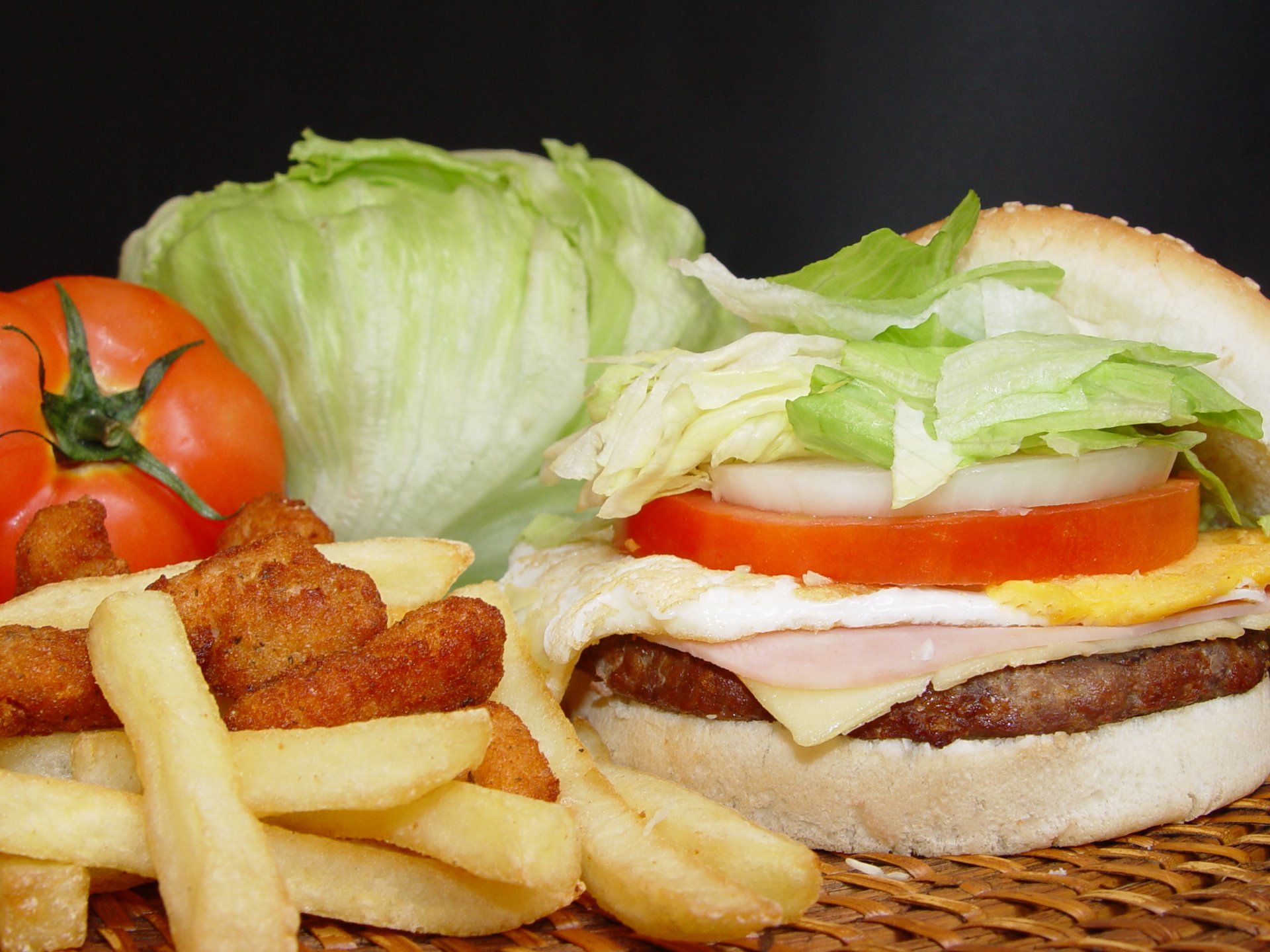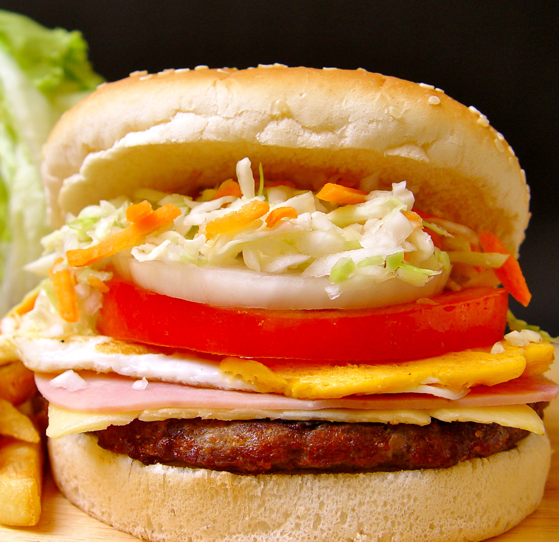 Hamburguesa especial; con jamón queso y huevo, tomate natural, cebolla, col rayada con zanahoria o escarola ( a elegir). 4,95€