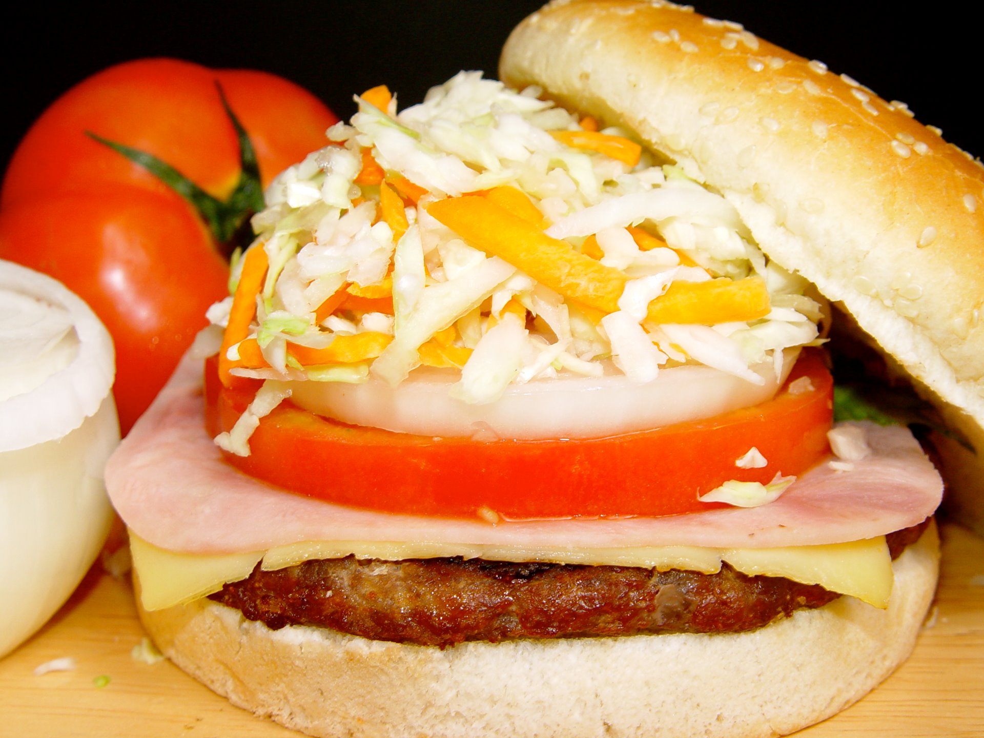 Hamburguesa con jamón y queso; tomate natural, cebolla, col rayada con zanahoria o escarola ( a elegir). 3,85€