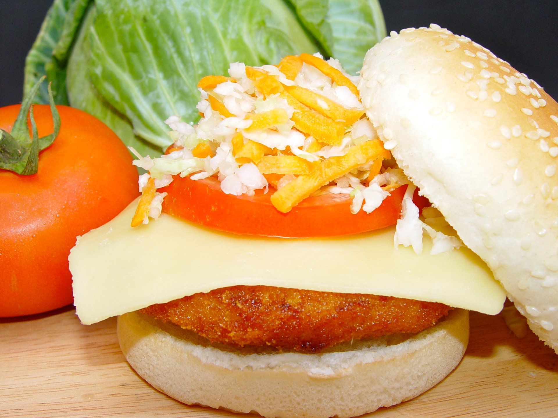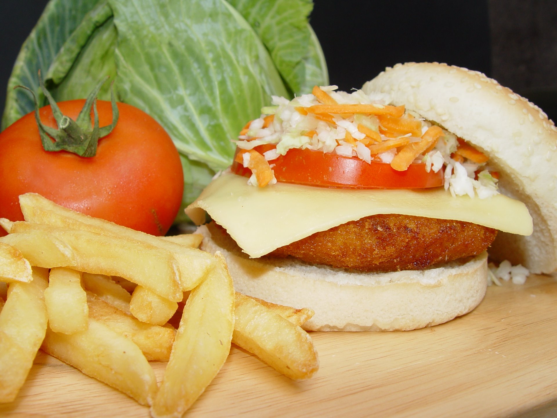 Hamburguesa pollo; con queso tomate natural, cebolla, col rayada con zanahoria o escarola ( a elegir). 4,45€