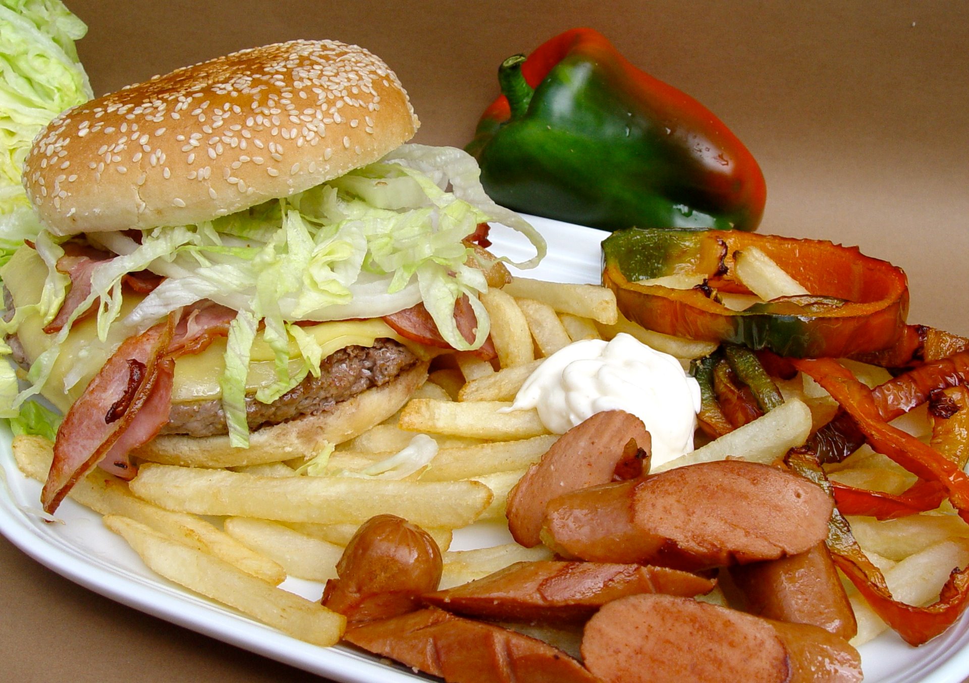 Menu Super 150 grs deliciosa hamburguesa de ternera con queso, beicon, cebolla, escarola, papas fritas, aros de pimientos y Frankfurt troceados 8,75€