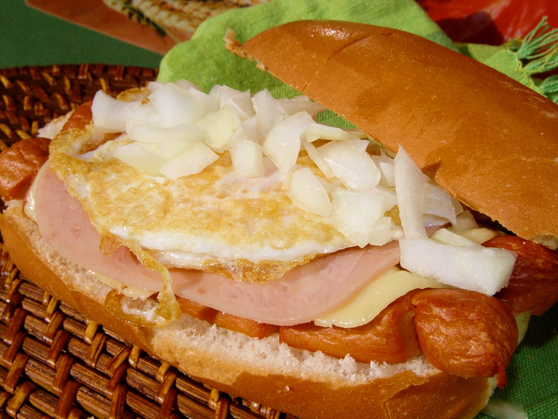 Perrito especial con jamón, queso, huevo, cebolla y las salsas 4,45€