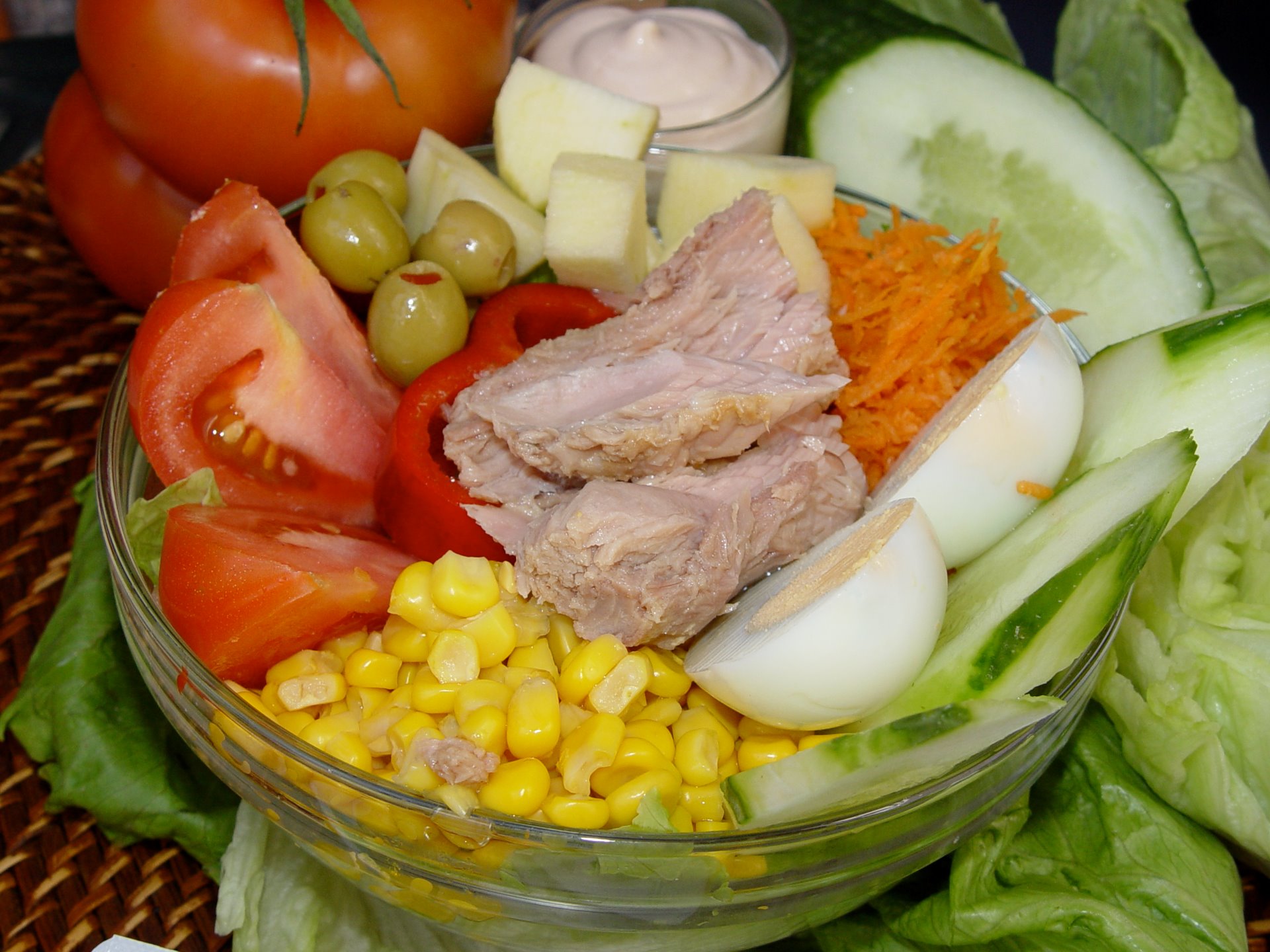 Ensalada whaoo..! escarola, tomate natural, maiz dulce, zanahoria, manzana, cebolla, huevo sancochado, piña, atún, aceitunas y aguacate 8,25€