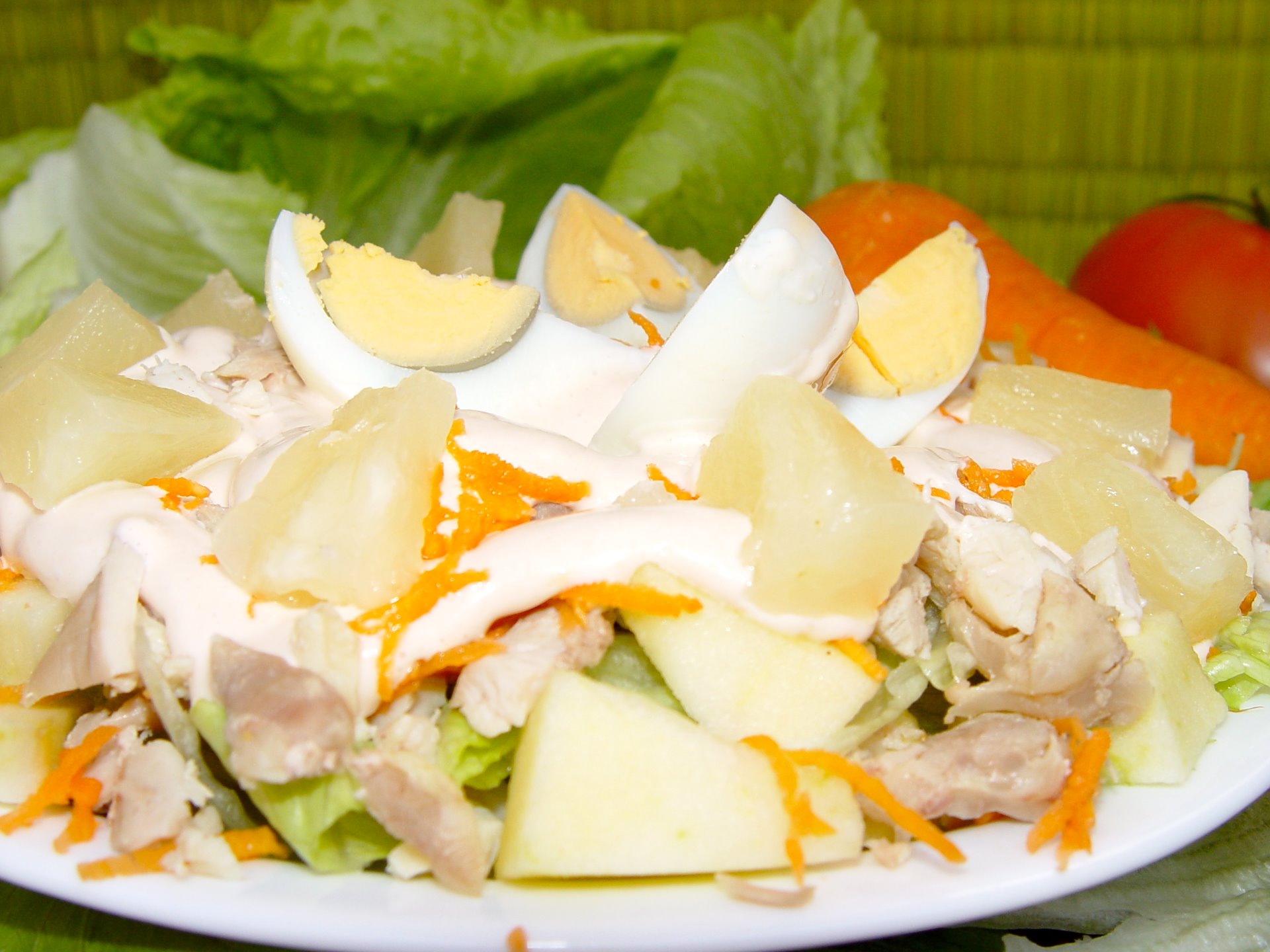Ensalada de pollo escarola, manzana troceada, pollo troceado, salsa rosa, zanahoria, maíz dulce, piña y huevo sancochado. 8,25€